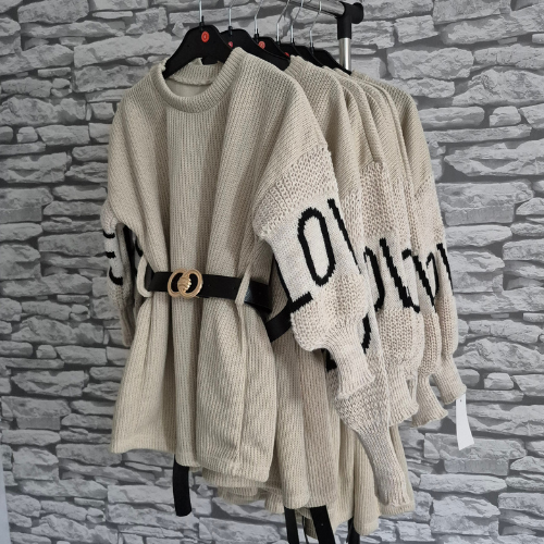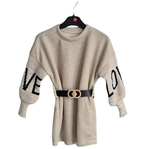 Update your child's wardrobe with our Beige 'Love' Perforated Sleeve Jumper Dress! Made with high-quality woven knit fabric, this jumper dress is both stylish and comfortable. The 'Love' quote motif and perforated sleeves add a trendy touch, while the gold buckle waist belt provides a flattering fit. Available in sizes 4-14 years.