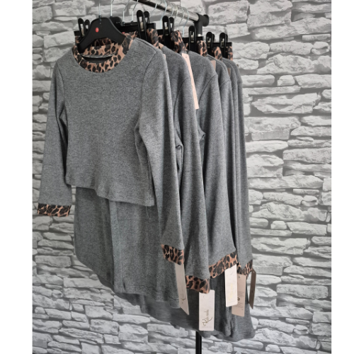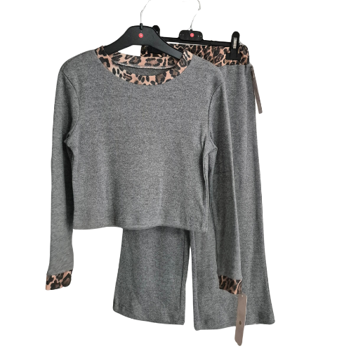 This 2-piece co-ord set features a grey sweatshirt top with sleek leopard print trim paired with coordinating wide leg lounge pants. Made for kids aged 4-14 years, this set offers both comfort and style in one. Perfect for a day of lounging or casual outings.