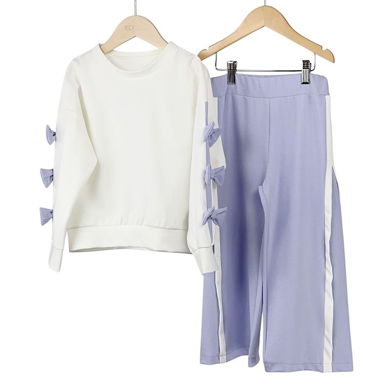 Dress them in effortless style with our Lilac Contrast Bow Lounge Set. Made for kids, this set features a soft, lilac purple and white contrast bow sweatshirt top paired with comfortable wide leg lounge pants. Perfect for all-day wear, your child will feel cozy and fashionable. Available in sizes 2-12 years.