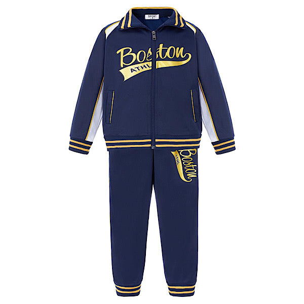 This navy and gold Boston tracksuit is the perfect addition to your child's wardrobe. The zip-up track jacket features a stylish Boston motif, while the coordinating joggers offer a comfortable and trendy fit. Available in sizes 4-14 years, this tracksuit is a must-have for any fashion-savvy kid.