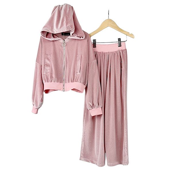 This stylish pink velour tracksuit set is perfect for active girls. The diamante studded detailing adds a touch of glamour, while the zipped hooded track jacket and wide leg track pants provide comfort and practicality. Available in sizes 4-13 years.